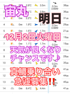 宙丸‼️明日12月2日火曜日、真鯛乗り合い急遽募集しまーす♪天気が良くなったので、チャンスです♪嵐の前の静けさ!大漁の気配ぷんぷんです。型も良くなってます。是非来てください!